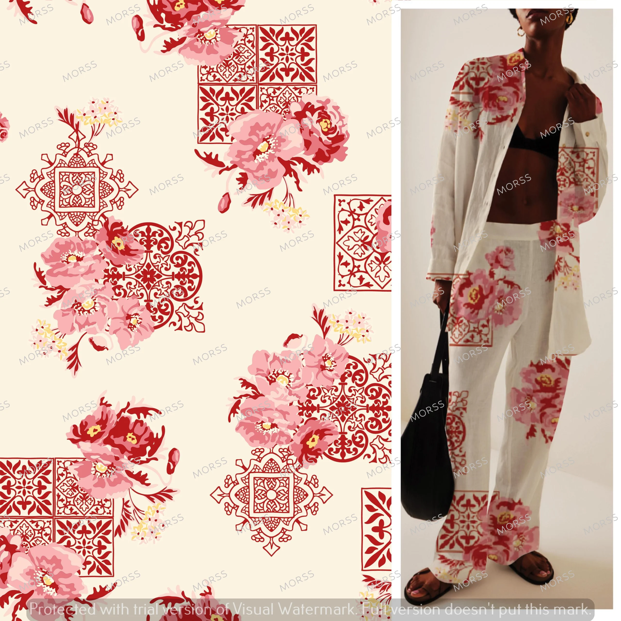 A harmonious fusion of timeless florals and intricate tile-inspired motifs, Blooming Retreat exudes elegance with its romantic pink peonies and ornate red geometric accents. This refined print is ideal for luxurious resort wear, sophisticated dresses, and statement home décor. Once purchased, Blooming Retreat is permanently retired, ensuring complete exclusivity for your brand.